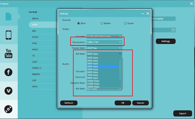 3. Kelik menu Export untuk memperkecil video silahkan pilih setting dan aturlah utamanya pada menu Resolution dan Bit Rate, silahkan anda atur semakin rendah resolusi dan Bit Rate yang dipilih maka size video akan semakin kecil. Namun jangan terlalu kecil karena nanti kualitas video akan jelek.