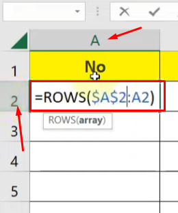 - Kemudian, pada bagian tabel nomor masukkan rumus ” =ROWS($A$2:A2) “, huruf A sesuai dengan tabel itu berada dan begitu juga dengan angka 2 nya.