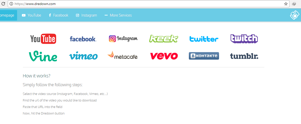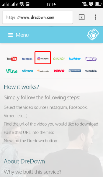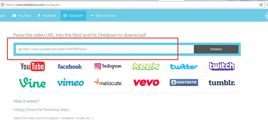Salah satu alternatif yang sangat saya rekomendasikan untuk mendownload video dari instagram adalah dengan dredown.com, dengan website ini kita tidak hanya bisa mendownload video dari Instgram saja namun hampir semua media sosial, silahkan langsung simak caranya :