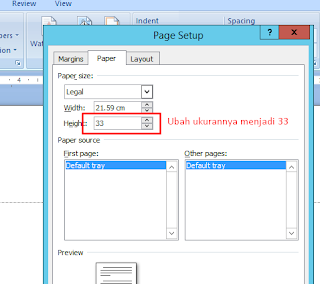 3. Kemudian pilih tab paper, ubahlan ukuran Highnya dari 35.56 menjadi 33, ukuran kertas F4 atau Folio sudah terbuat