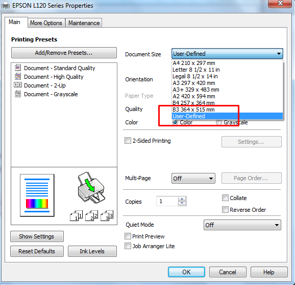 2. kemudian klik Properties, pada dokument Size pilihlah User-Defined