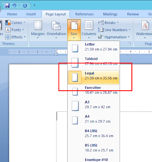 1. Klik Page Layout pilih ukuran kertas Legal terlebih dahulu