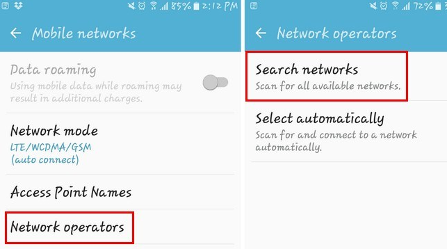 Jika operator jaringan yang Anda gunakan bukan yang dipilih dalam pengaturan perangkat Android Anda, Anda pasti akan mendapatkan kesalahan kartu SIM. Untuk memastikan bahwa Anda memiliki yang benar, pergi ke “Settings -> Mobile Networks -> Network Operators -> Search Networks” Setelah perangkat Android Anda selesai mencari dan menampilkan hasilnya, klik pada operator Anda.